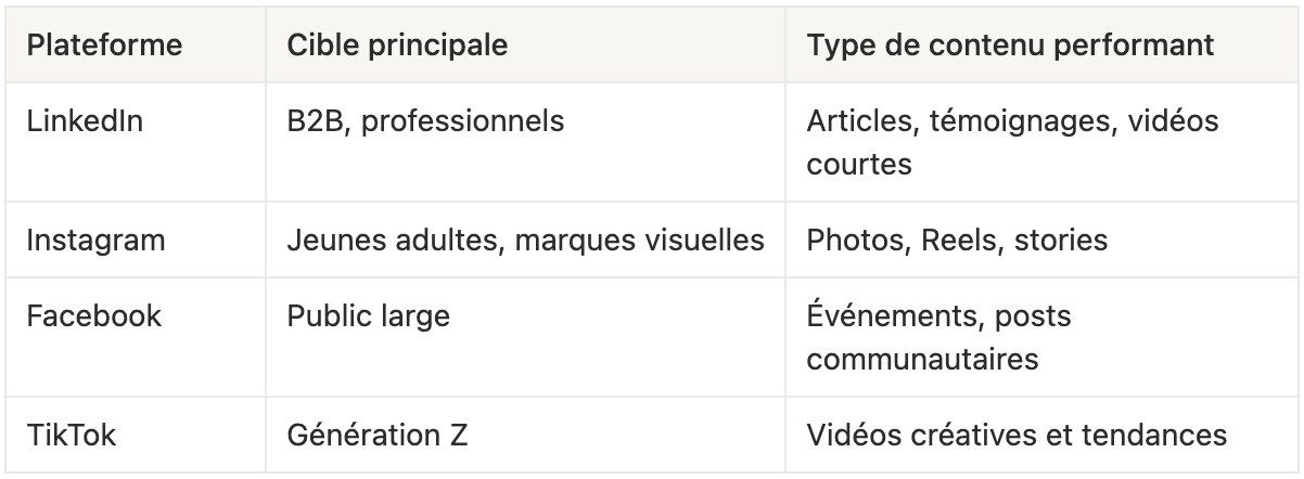 Exemple : une PME B2B misera sur LinkedIn pour générer des leads qualifiés, tandis qu’une marque lifestyle privilégiera Instagram pour sa visibilité.